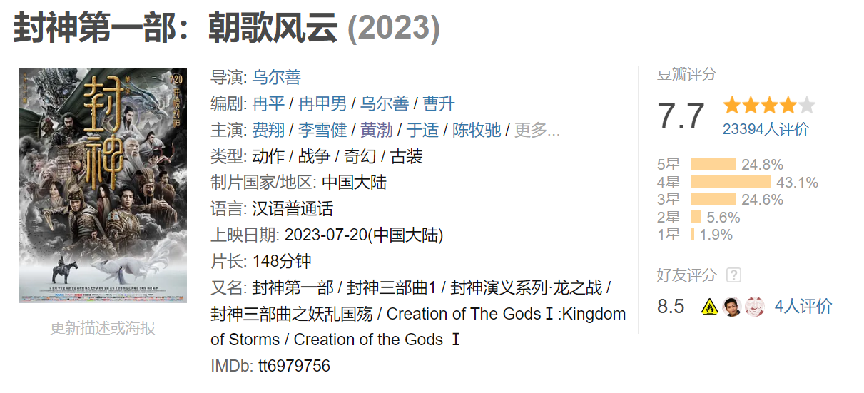和其他电影上映几天才开分不同,由于《封神第一部》从7月15日开动不时寰宇大边界点映,因此上映首日即开分。现在猫眼评分高达9.4,主流酬酢平台的大V推选度90%,即便对这类贸易大片特地残暴的豆瓣,评分也达到7.7,其中四星和五星好评占比接近68%,口碑特地可以。