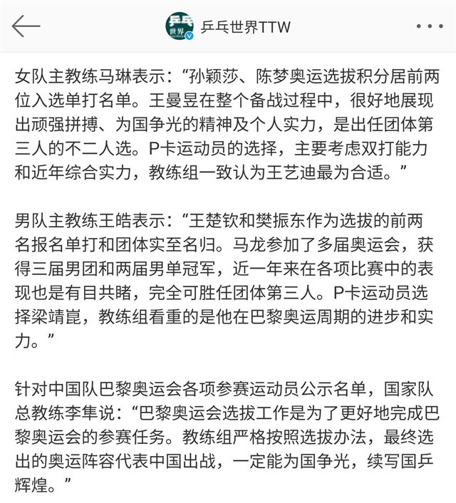 国乒施展组对本次奥运名单进行了解读。马琳谈王艺迪拿P卡时:“施展组一致以为王艺迪最为稳妥”;王皓提梁靖崑的P卡时:“施展组垂青的是他在巴黎奥运周期的跳跃和实力。”除此以外,即是李隼为总共这个词大名单公说念性进行回想:“施展组严格按照聘用想法,最终选出的奥运威望将代表中国出战!”